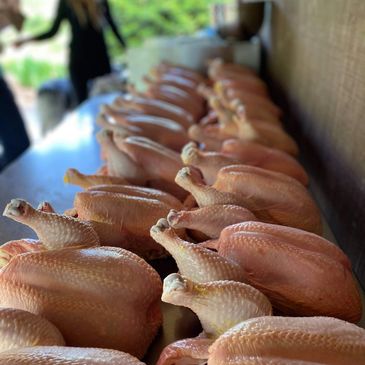 The birds spend the majority of their lives on the farm, from arriving as 2 day old chicks from Freedom Ranger Hatchery to processing at 8 weeks. We catch them early in the morning to prevent stress when crated. Birds are processed on site, aged 2 days in ice water and then shrink wrapped, weighed and frozen.